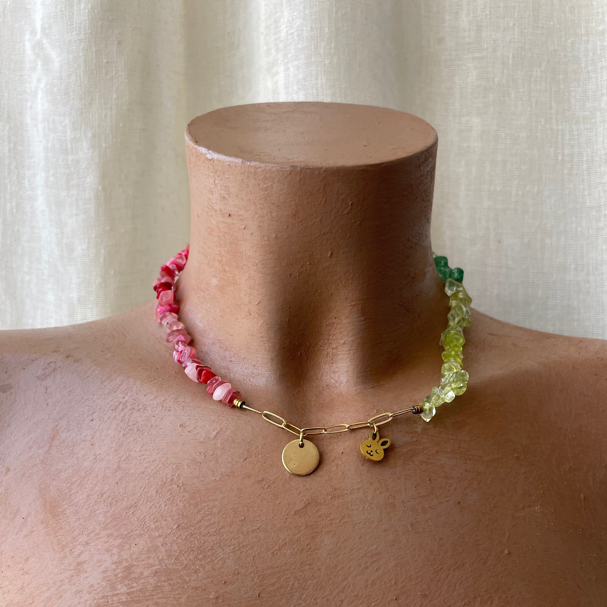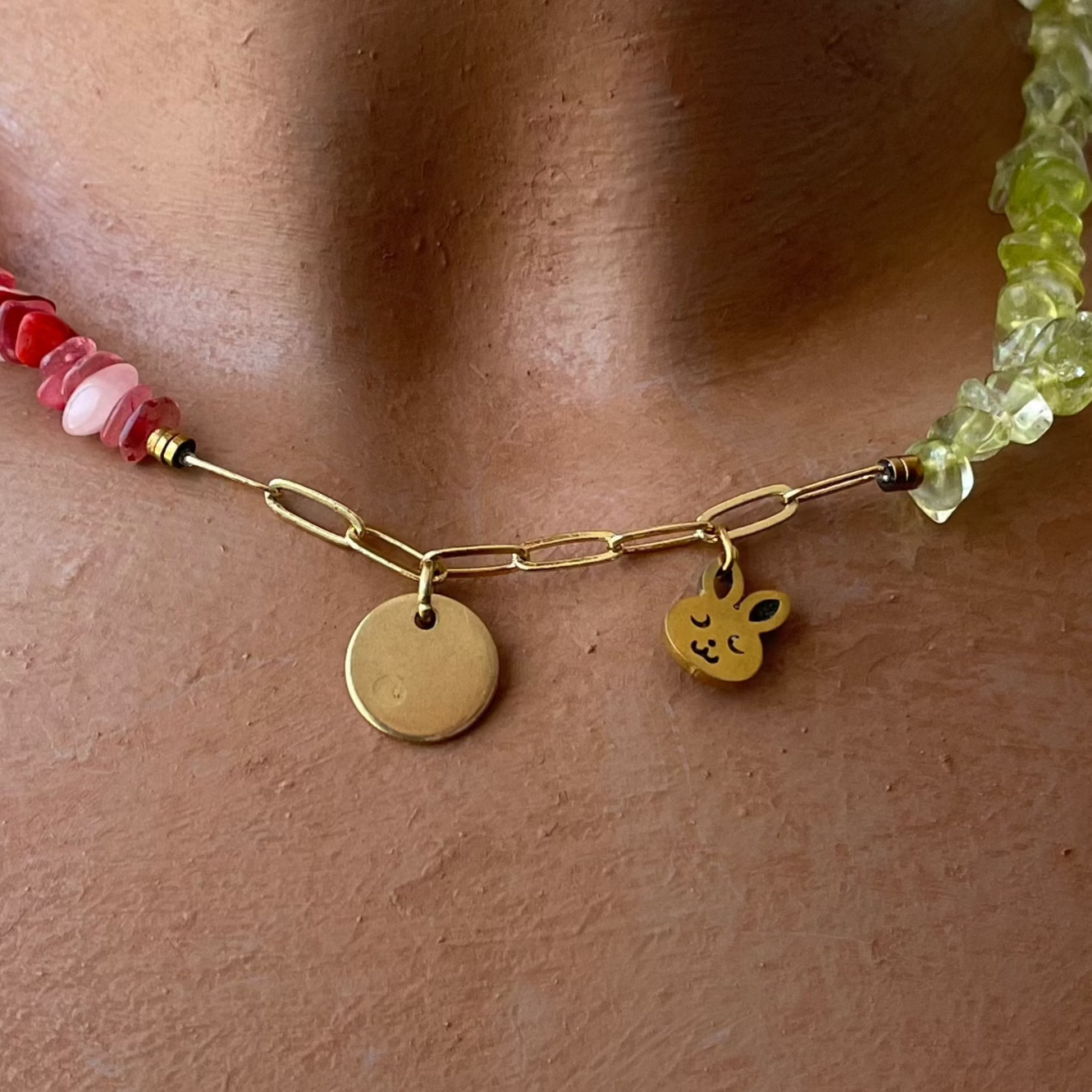 Two-tone semi-precious stone chips. 9ct plated paper clip chain and charms.
