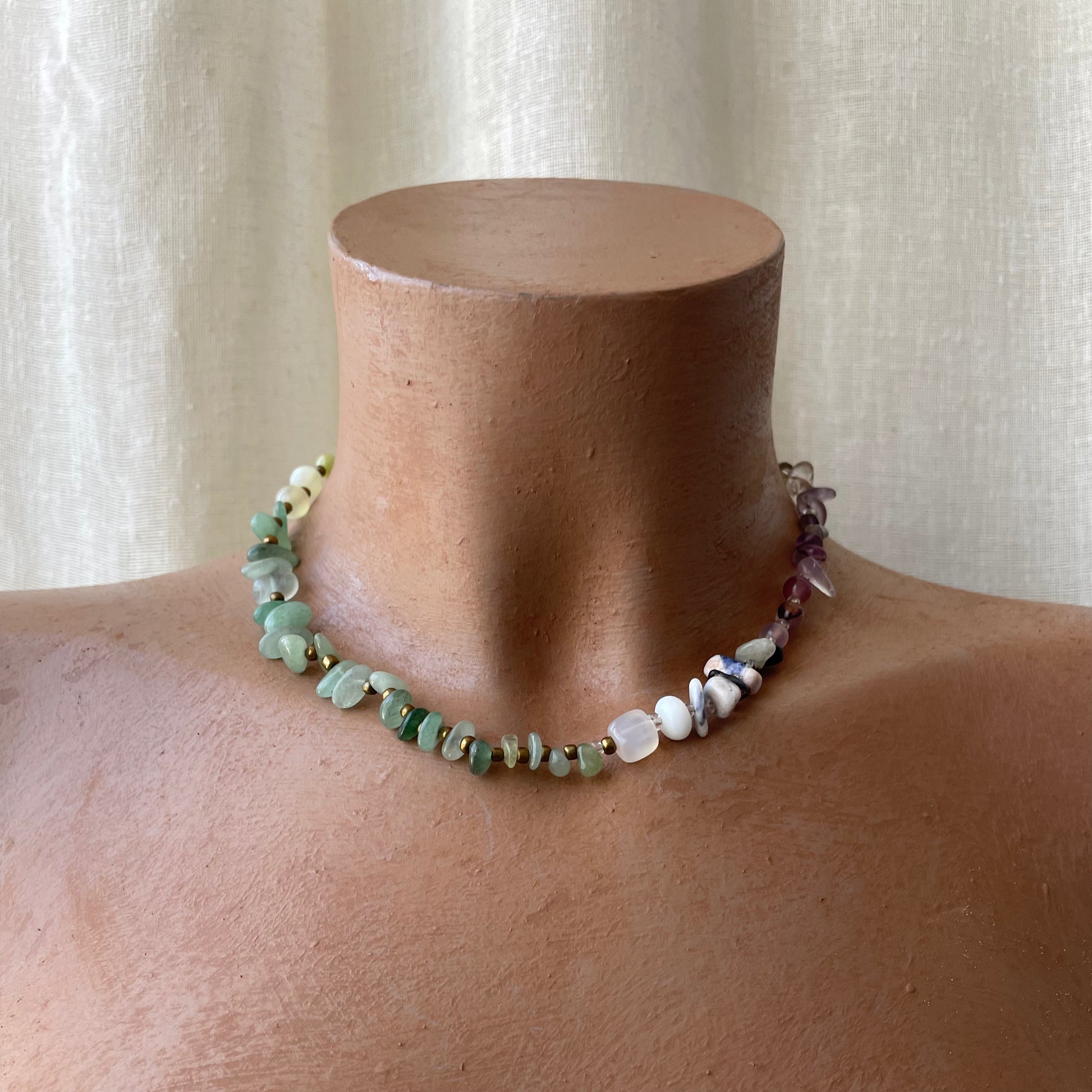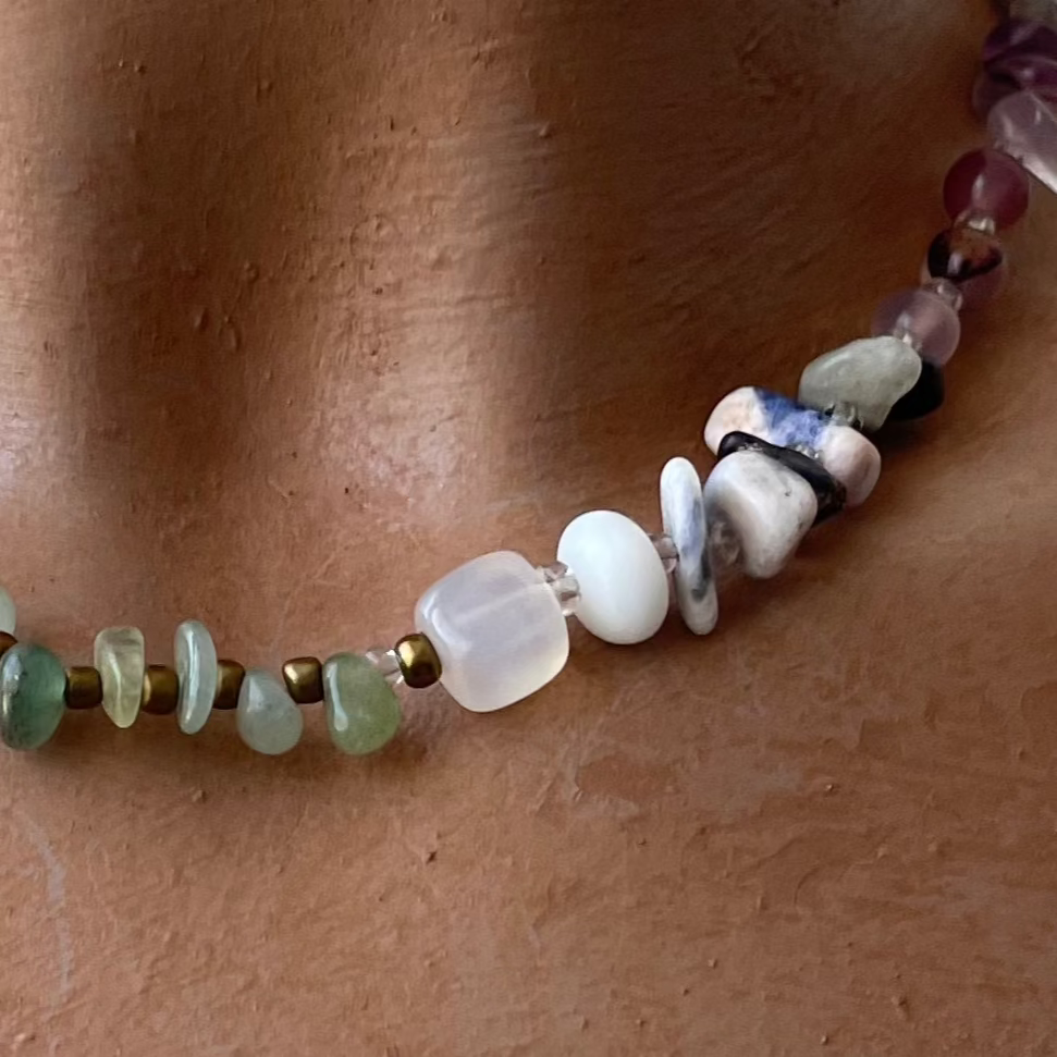 Various Semi-Precious beads and chips beautifully curated into colour gradient pattern, gold hematite spacer.