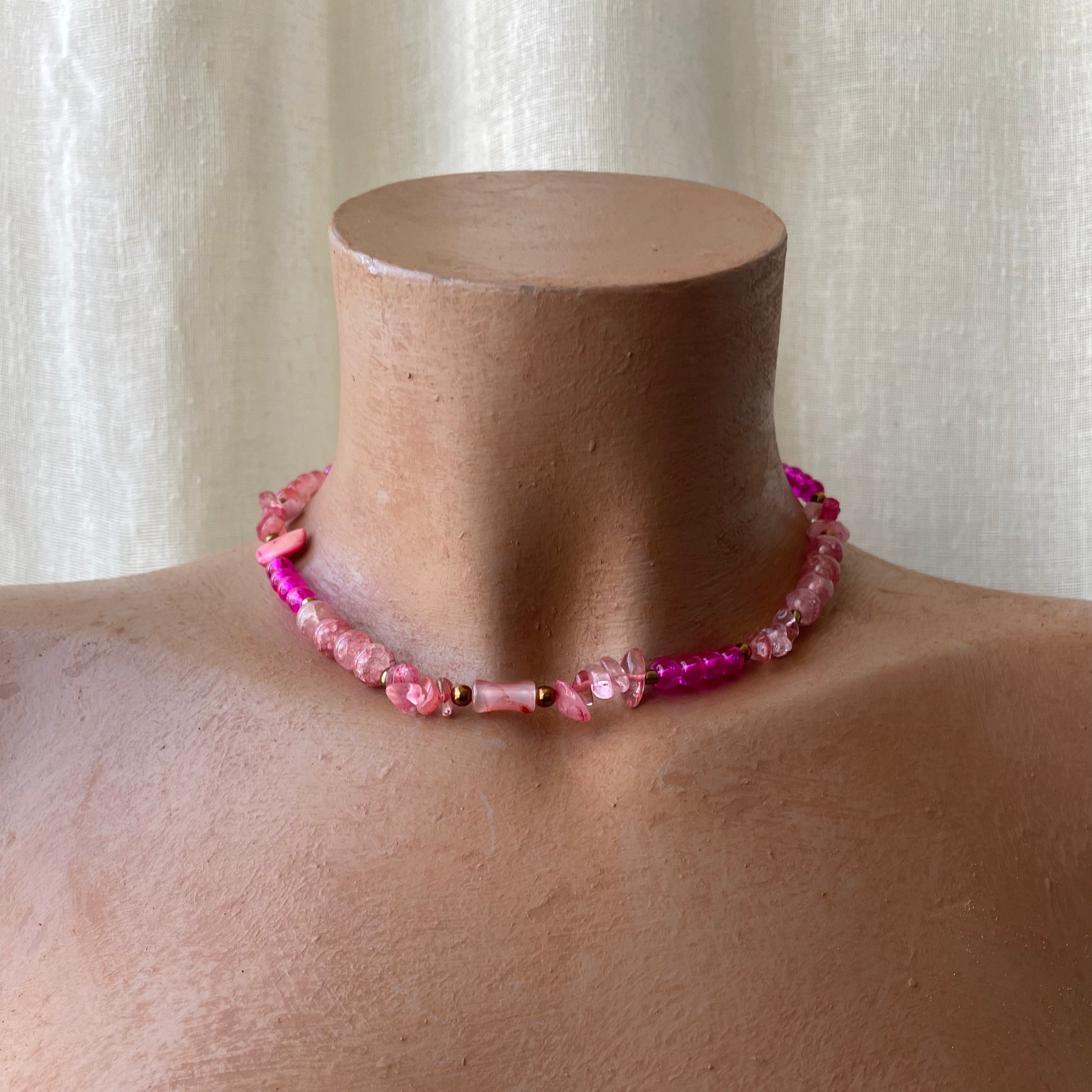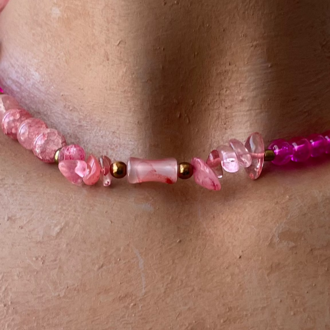 Monochromatic, patterned arrangement of semi precious beads and chips. Held by gold hematite spacers.