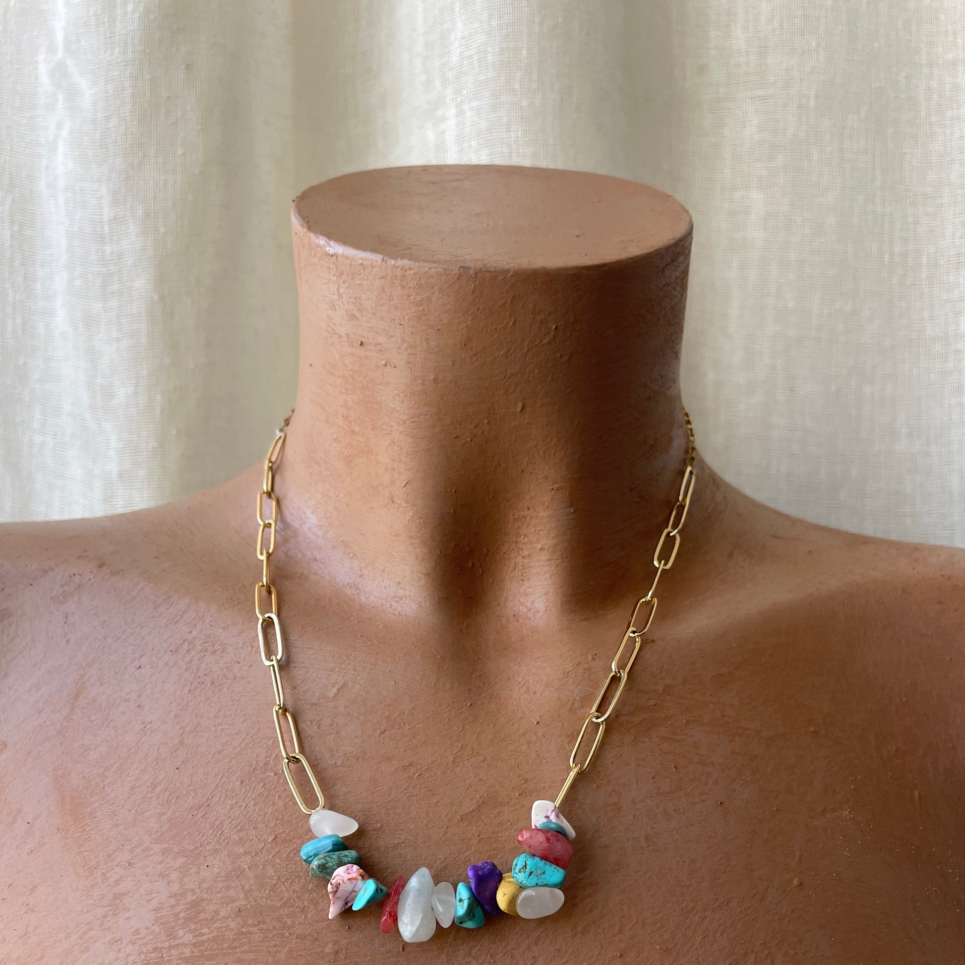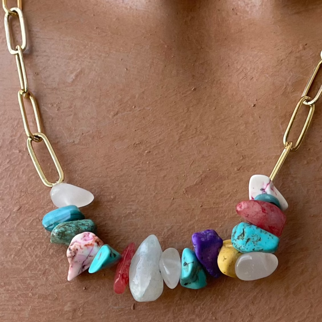 A Whimsical combination of Bright & Vibrant Colourful stone chips held by a gold plated brass paper clip chain.